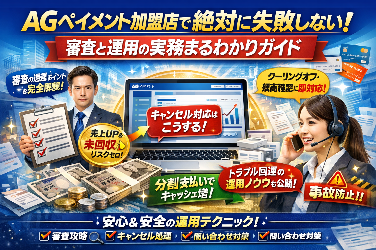 本記事では、AGペイメントサービスをクレジットカードや自社ローンとどう組み合わせるかという決済戦略から、加盟店審査で見られる販売方法と契約実務、加盟店ログイン画面を使った手数料シミュレーションやキャンセル処理の勘所、さらには顧客からの残高確認・一括返済・支払い遅れ・クーリングオフの問い合わせに即答できる案内スクリプトまで、現場で本当に役立つ情報だけを整理しました。