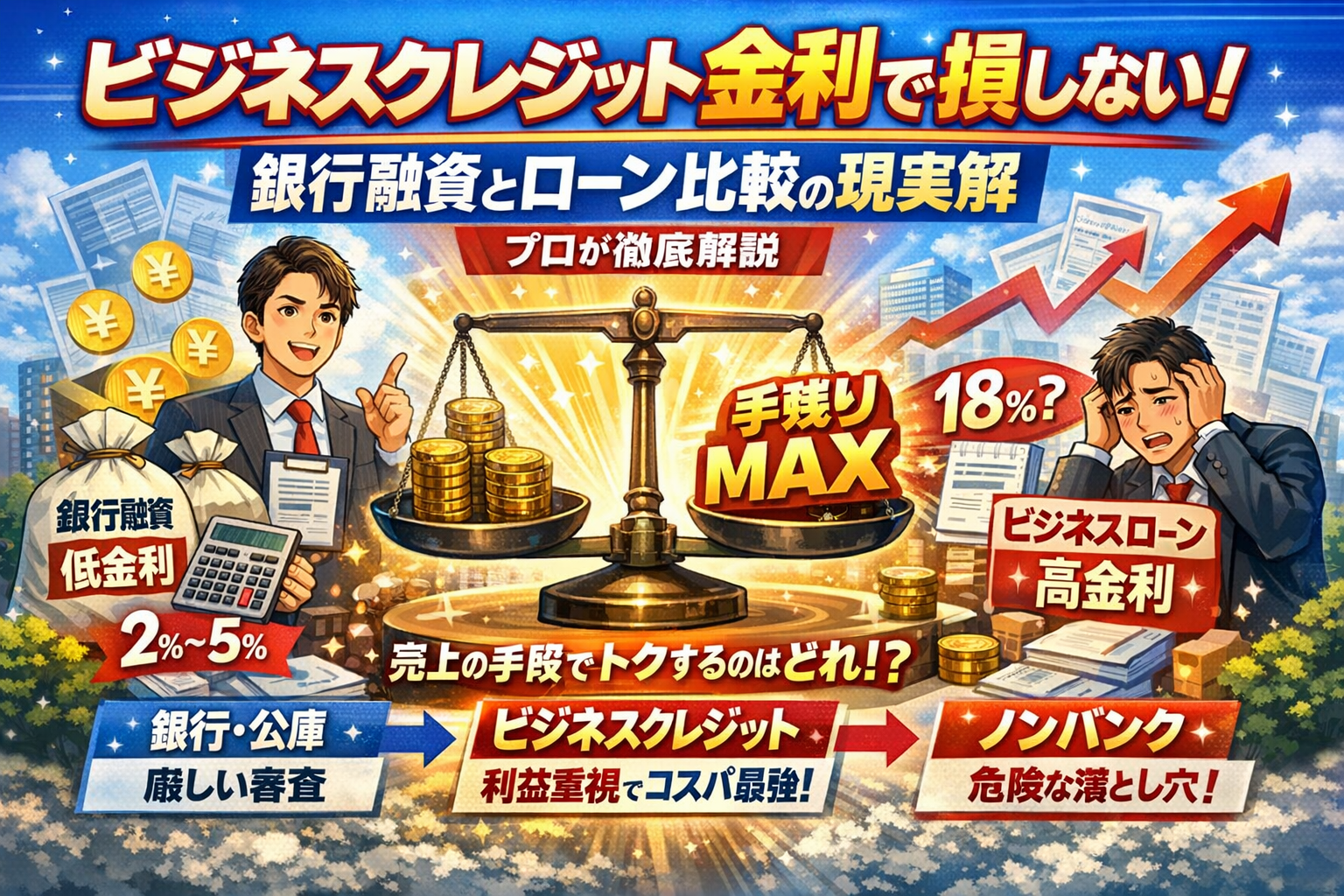 この記事では、金利だけを追いかけて判断を誤る方を一人でも減らしたいという思いから、融資とビジネスクレジットをどう組み合わせれば手残りが最大化するかを、現場で見てきた感覚をもとに整理しました。ビジネスクレジットを「借金」ではなく「売上設計の道具」として捉え直すきっかけになればと考えています。