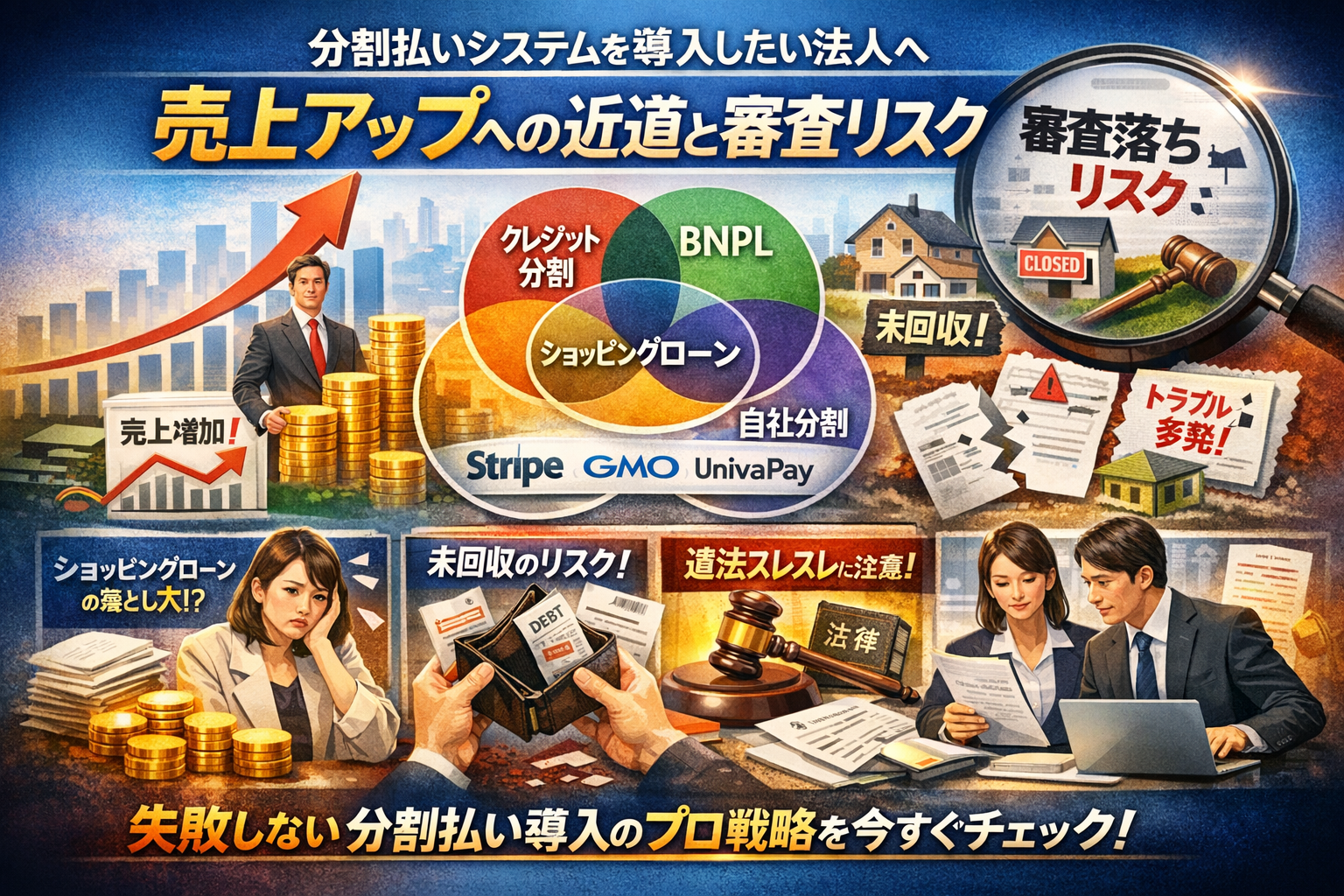 本稿では、StripeやGMOイプシロン、UnivaPay、アルファノートなどの分割決済サービスを、エステやスクール、Web制作など法人の業種・単価・販売方法ごとにどう組み合わせるかを整理し、ショッピングクレジットとショッピングローン、自社分割や擬似分割との違いまで一気通貫で解説します。さらに、審査で見られる販売方法や契約書の盲点、法人クレジットカードの分割可否、分割決済が違法スレスレになる典型パターンまで踏み込みます。