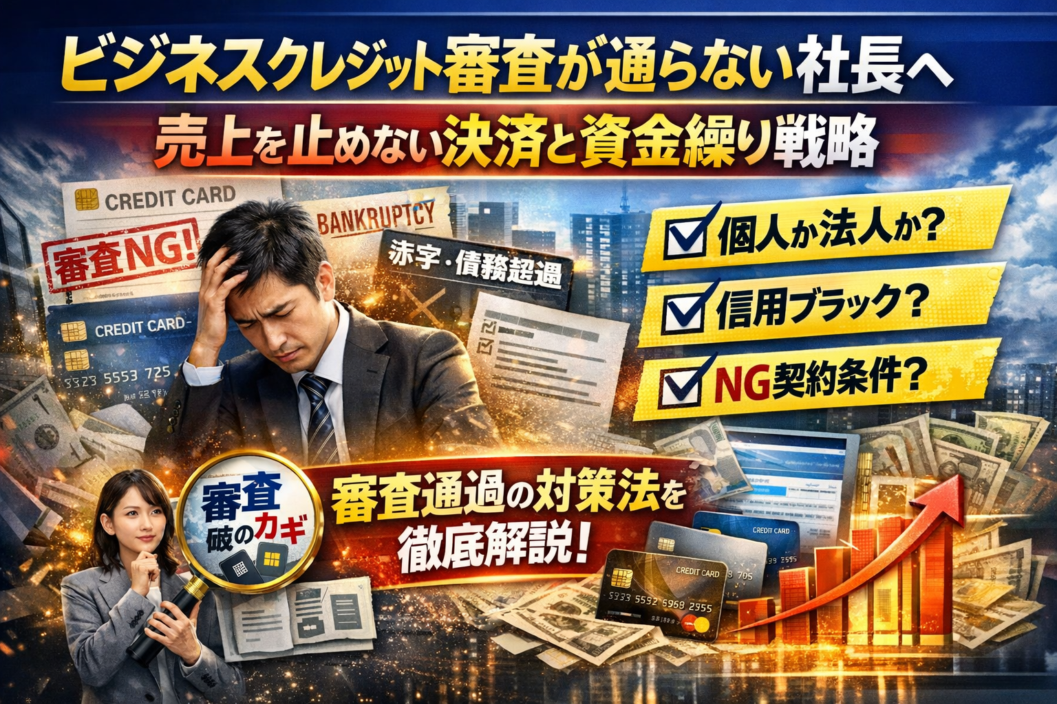 「ビジネスクレジット審査通らない」「法人カード審査落ちた」と検索しても、三井住友やJCBなどカード会社ごとの一般論や「法人カード審査甘いランキング」を眺めて終わっていないでしょうか。役務ビジネスの社長にとっての本当の損失は、審査に落ちた事実そのものではなく、なぜ落ちたのかを事業と契約設計のレベルで特定できていないことです。個人の信用情報か、法人の属性か、コーポレートカードの社員審査か、契約書やクーリングオフ条項か。原因ごとに有効な対処法と選ぶべき決済・金融機関のルートはまったく違います。この記事では、法人クレジットカードやビジネスローンだけでなく、ビジネスクレジットやショッピングクレジットを含めて、どの枠であれば自社が通過しやすいかを、審査基準の実務目線で分解します。そのうえで、エステやスクール、Web制作など役務商材特有の落とし穴を前提に、単価や回数、提供フロー、説明資料をどう変えれば審査結果が変わるのかを具体的に示します。「法人カード審査なし」「ブラックでも作れるカード」といった噂に振り回される前に、自社の決済戦略と資金繰りを最短距離で立て直したい方こそ、この先を読み進めてください。