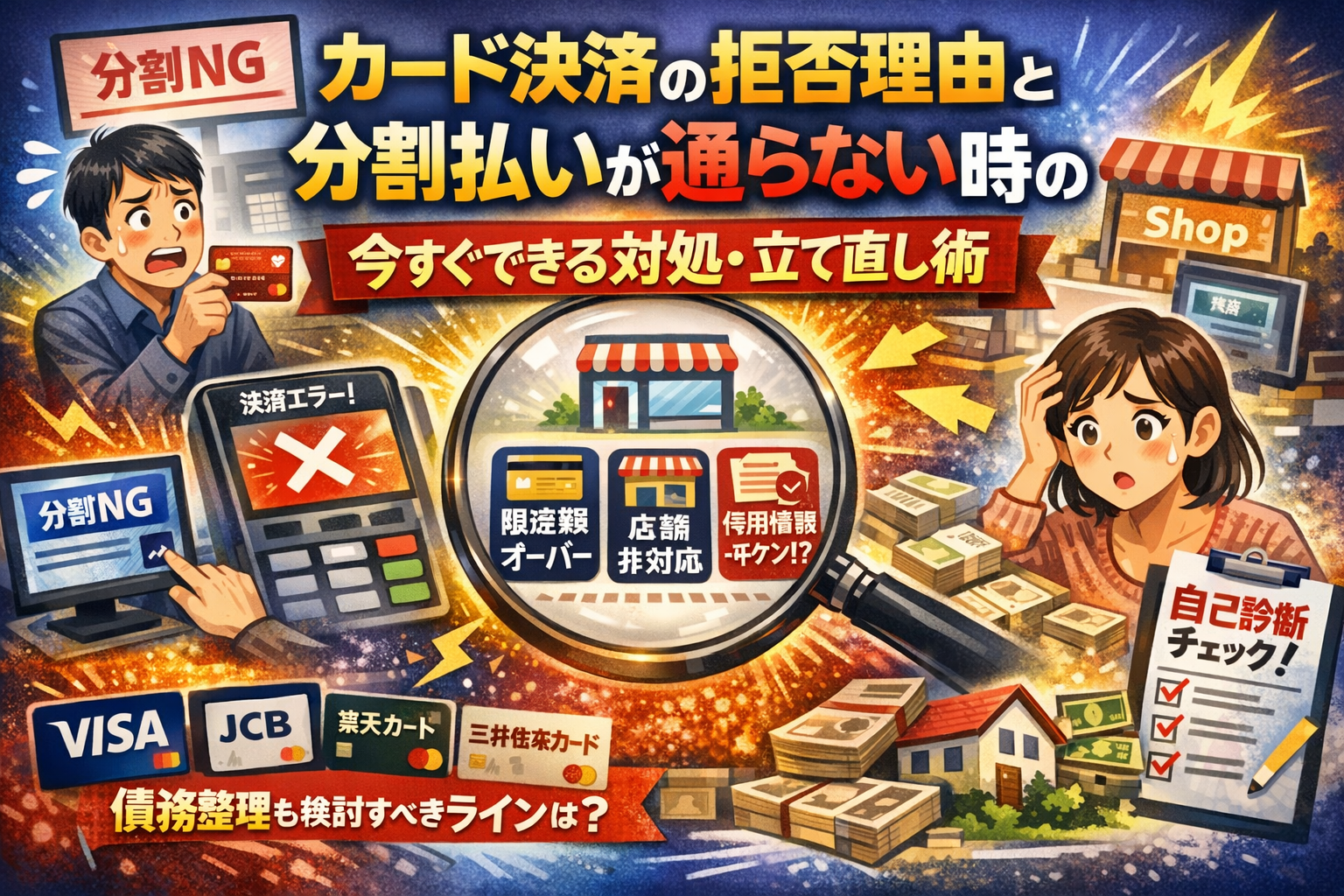 本記事では、カード決済の拒否理由と分割払いができない原因を、カード側・店舗側・利用者側という三方向から分解し、割賦枠や業種制限、「一括払いしかできない店でもあとから分割にできるケースとできないケース」まで具体的に示します。さらに、VISAとJCB、楽天カードや三井住友カード、MUFGカードごとの分割回数やあとから分割の条件、信用情報や住宅ローン審査への影響、「ここから先は専門家相談を検討すべきライン」まで一気に整理します。