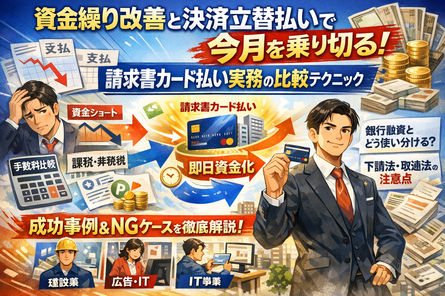 毎月の資金繰り表を眺めながら、「支払サイトだけ短縮され、売掛はそのまま。銀行融資も限界。今月どう乗り切るか」と頭を抱えていませんか。検索上位の要約情報は「請求書カード払いなどの決済立替払いを使えば資金繰り改善に役立つが、手数料やファクタリングとの違いに注意」というところで止まっています。しかし実務では、その一歩先の設計を誤ると、手数料と最低利用額、課税・非課税、ポイントやキャンペーンの誘惑で、静かに手元資金が削られていきます。