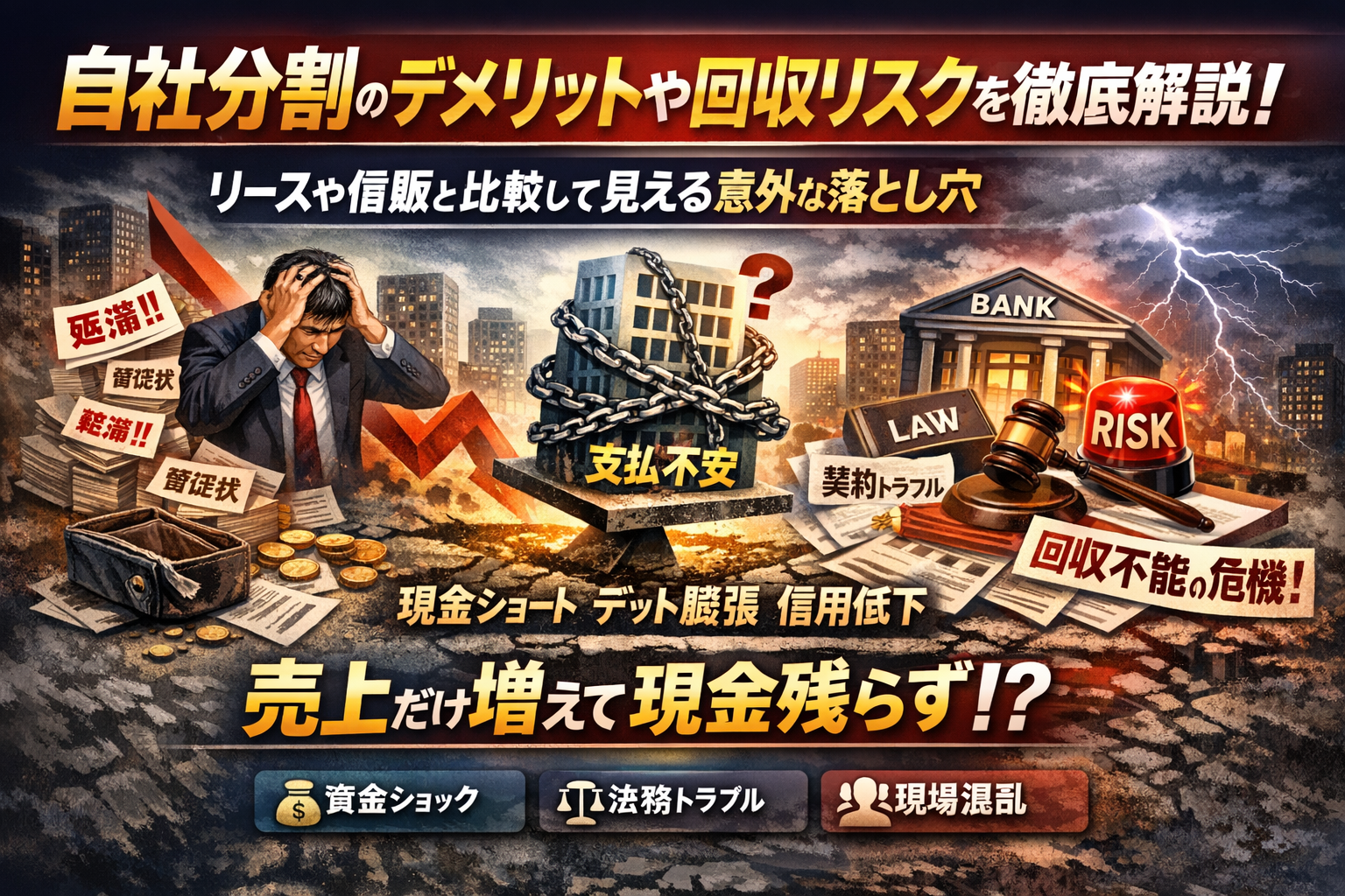 自社分割を「成約率が上がる魔法のローン」として導入すると、多くの中小企業で起こるのは売上だけ増えて現金が残らないという現象です。月々の支払を細かく割ったつもりが、延滞債権と督促対応が積み上がり、銀行や投資家からはデットが膨らんだ危うい企業として評価されるケースも珍しくありません。優良資産だけを別会社に移す会社分割が債権者の回収リスクを高めるのと同様に、設計の甘い自社分割も、取引先ではなく自社の資金繰りと信用情報を直撃します。