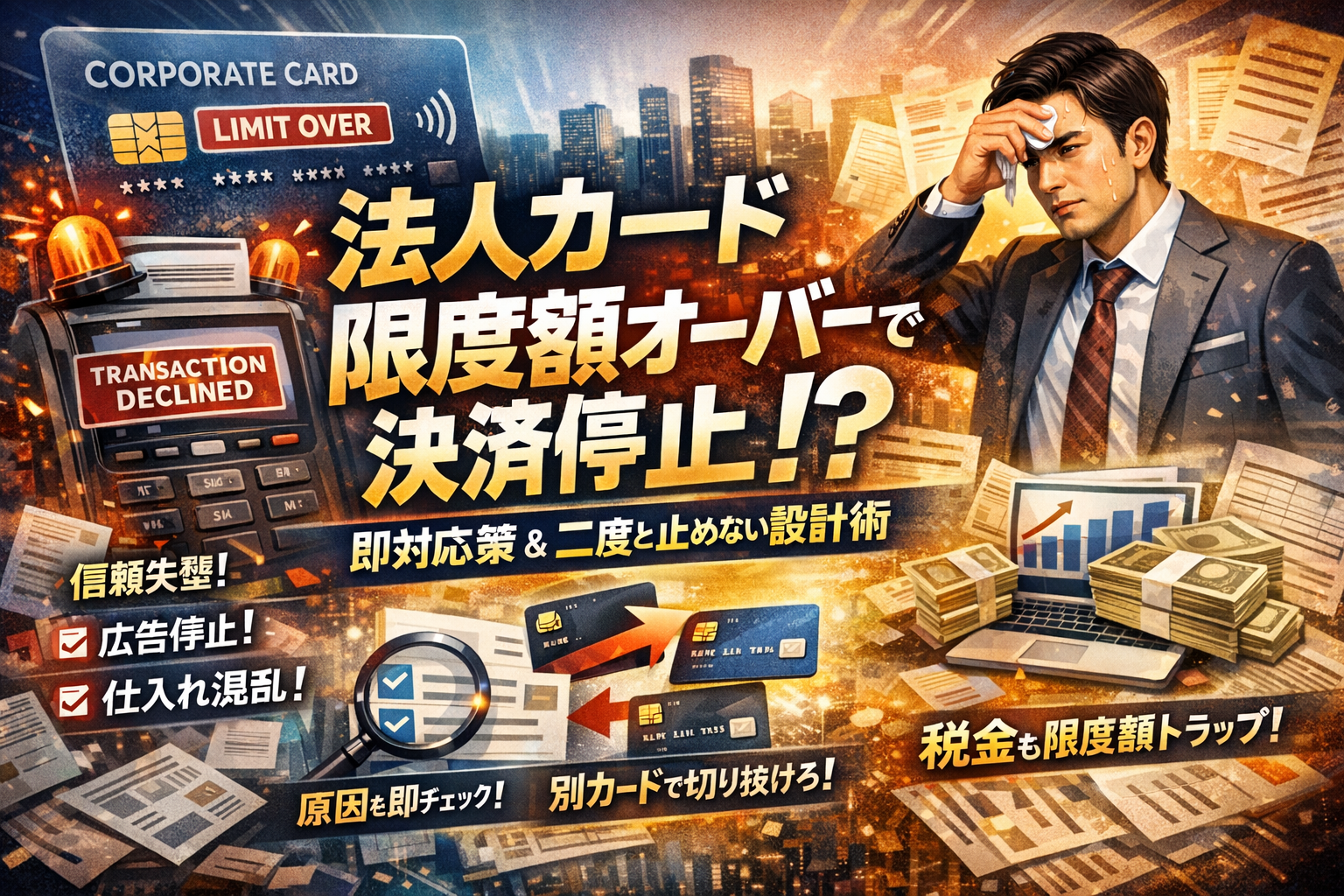 法人カードの決済が突然止まる瞬間、実際に失っているのはその支払いだけではありません。取引先との信頼、社内の段取り、広告や仕入のタイミングまで、一度の限度額オーバーが静かに毀損していきます。多くの解説は「法人カード限度額の平均」「限度額引き上げの条件」をなぞるだけですが、現場で問われるのは今日のこの決済をどう通し、来月以降二度と止めないかという一点です。