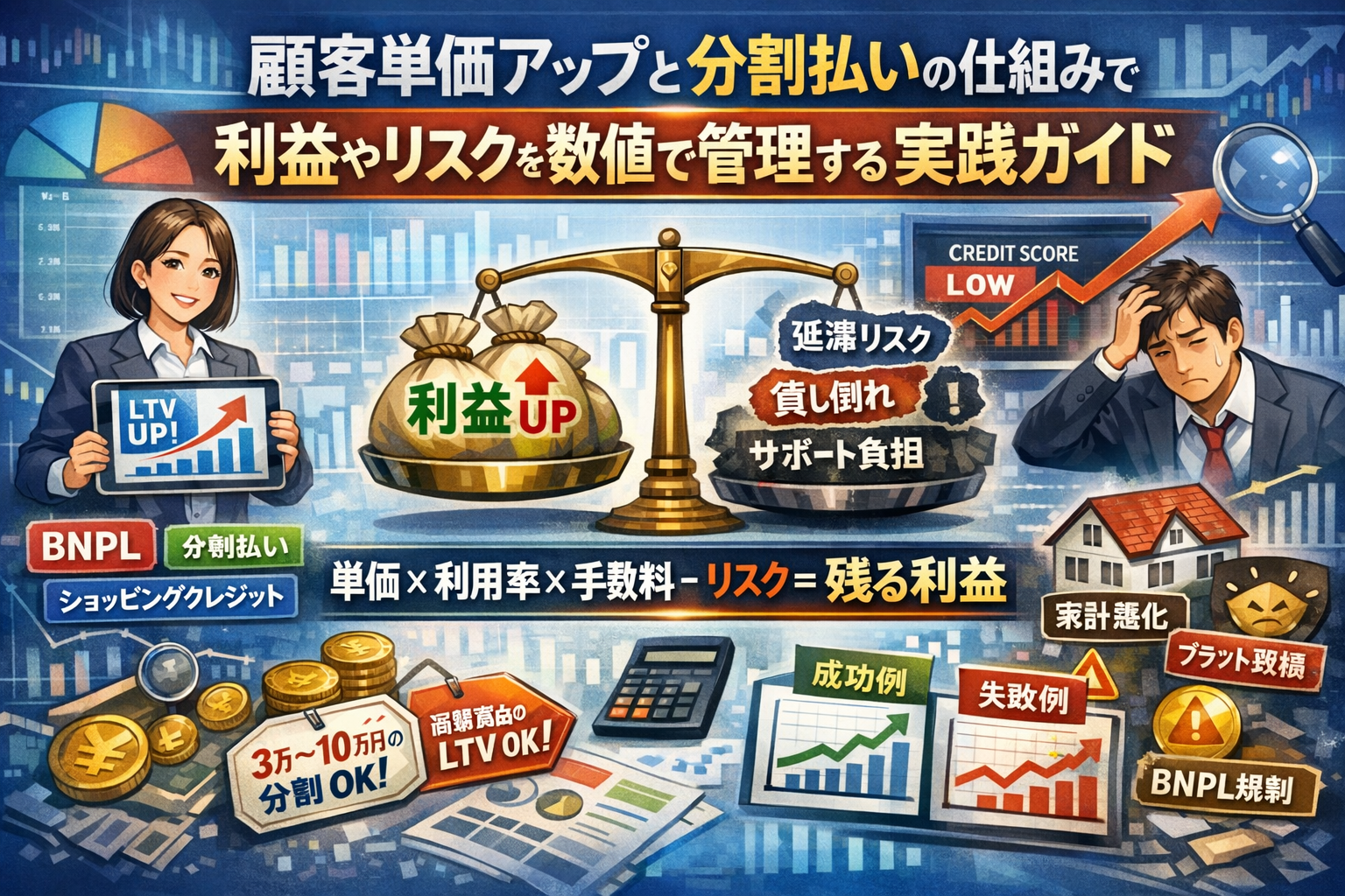 仕事柄、顧客単価アップの相談を受けると、かなりの確率で分割払いとBNPLの話になります。売上を伸ばすために導入したはずが、数か月後には延滞と返金対応に追われ、手元の利益がほとんど残っていない決済レポートを一緒に見た経験が何度もあります。中には、高額スクールや美容医療でクレームが連鎖し、口コミサイトと信用情報の両方に傷がついてしまったケースもありました。共通していたのは、単価と件数だけを追いかけ、手数料と貸し倒れリスクを一枚の表で管理していなかったこと、そしてお客様の家計と信用情報への影響をきちんと説明していなかったことです。私自身、自分のパソコンで作った粗い試算表を信じて分割条件を緩くしすぎ、キャッシュフローが急激に悪化した苦い失敗があります。そのとき、金融庁の資料や事業者向けガイドラインを読み込み、カード分割やショッピングクレジット、自社分割との違いを、数字ベースで徹底的に整理し直しました。本記事では、その過程でつくり込んだ計算の考え方と、現場で見てきた成功と失敗のパターンを、事業者が自分で判断できる形に落とし込んでいます。短期の成約率だけでなく、LTVとブランド、お客様の生活を守る決済設計を一緒に作りたいという思いから、このテーマを選びました。