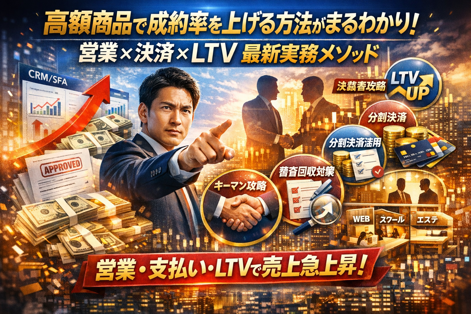 高額商品だけ「検討します」で止まり、営業の時間とメンタルだけが削られていないでしょうか。実は、高額商品で成約率が落ちる原因は、営業スキル不足ではなく、高額×無形×決済×LTVを一体で設計していないことにあります。機能説明や値下げでは、高額役務は動きません。売れている企業は、顧客が得る「変容」を軸にヒアリングと提案を組み立て、キーマンを正しく押さえたうえで、分割決済や信販を使いこなし「支払い条件そのもの」を提案価値に変えています。さらに、審査落ちや回収トラブルを前提にした与信設計と、SFA・CRMでのプロセス管理までセットで組むことで、少ない商談数でも安定して成約を積み上げています。この記事では、新規開拓営業がきつい現場で実際に起きている失注パターンを分解し、ヒアリングの質問、決裁者攻略、支払い設計、審査対策、LTVとアップセル・クロスセルまでを一気通貫で解説します。ここに書かれているのは研修用の一般論ではなく、高額役務と分割決済を日常的に扱う現場の実務ロジックです。読み進めるかどうかで、同じ商談数でも手元に残る売上は確実に変わります。