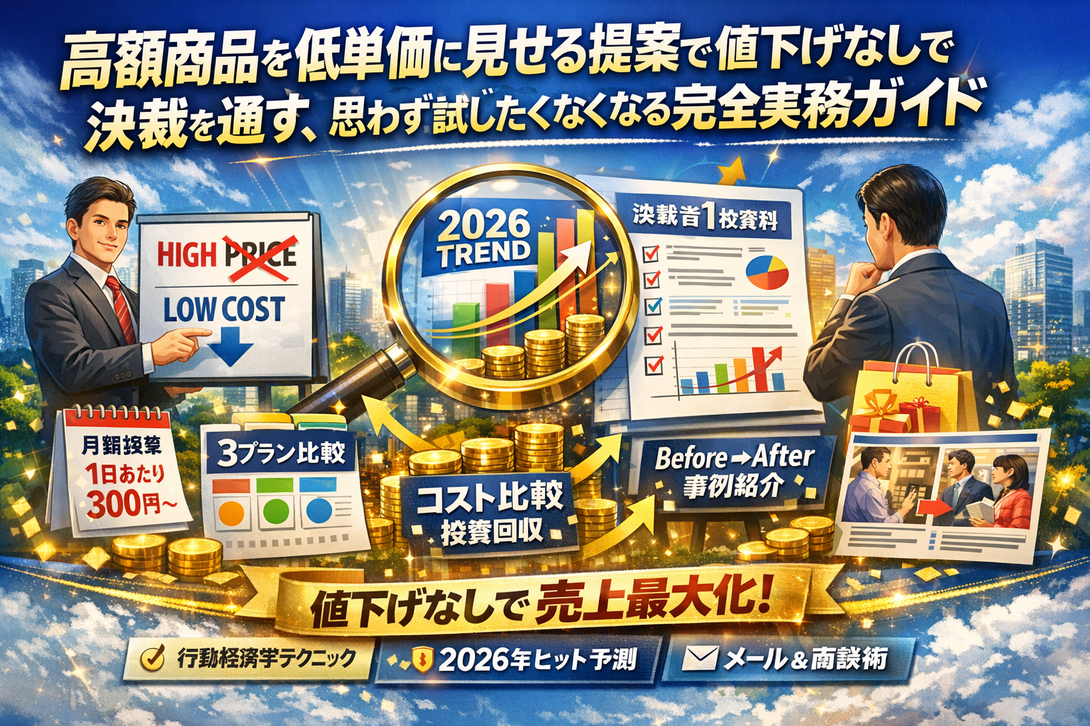 この記事では、高額商品を低単価に見せる提案を、価格設計×資料構成×事例紹介×ノベルティ×2026年トレンドまで一気通貫で分解します。営業資料ペライチ1枚で通す構成、値下げなしで乗り切るメール・LINE文面、ノベルティやオリジナルグッズから高額バックエンドへつなぐ動線、決裁者用1枚資料のチェックリストまで、明日の商談にそのまま写経できるレベルで提示します。ここで整理された実務ロジックを知らないまま提案を続けること自体が、静かな値引きと機会損失になっていると認識して読み進めてください。