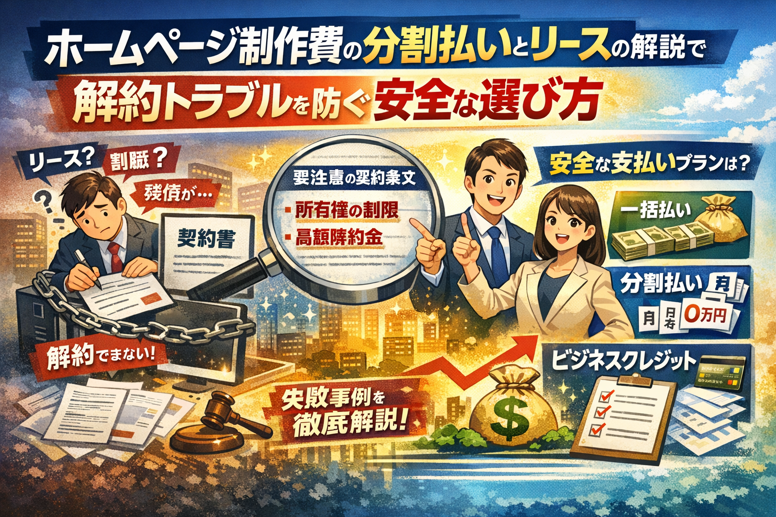 ホームページ制作費を分割払いにするとき、いちばん危険なのは「リース」「割賦」「ビジネスクレジット」の違いが曖昧なまま契約書にサインしてしまうことです。金額や月額だけを見て判断すると、解約できないホームページリース契約や、所有権の条文で縛られるリース商法寄りの条件を飲み込んでしまい、あとから大きな解約トラブルと残債だけが手元に残ります。