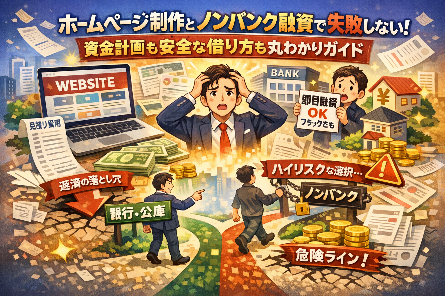 本記事の結論は明確で、ホームページ制作をノンバンク融資で賄ってよいケースは限定的であり、条件を外すと「サイトは動かないのに返済だけ続く」という構造的な失敗になります。そこでまず、見積書に出てこない制作費や広告費を含めたリアルな総額と回収イメージを押さえ、そのうえで銀行融資・公庫・ノンバンクビジネスローン・不動産担保ローンの役割の違いを実務目線で整理します。さらに、「法人融資審査甘い」「ブラックOK」「即日融資」「個人向けカードローン流用」といった甘いコピーの裏側を、個人事業主と法人それぞれの典型的な失敗事例を交えて分解します。