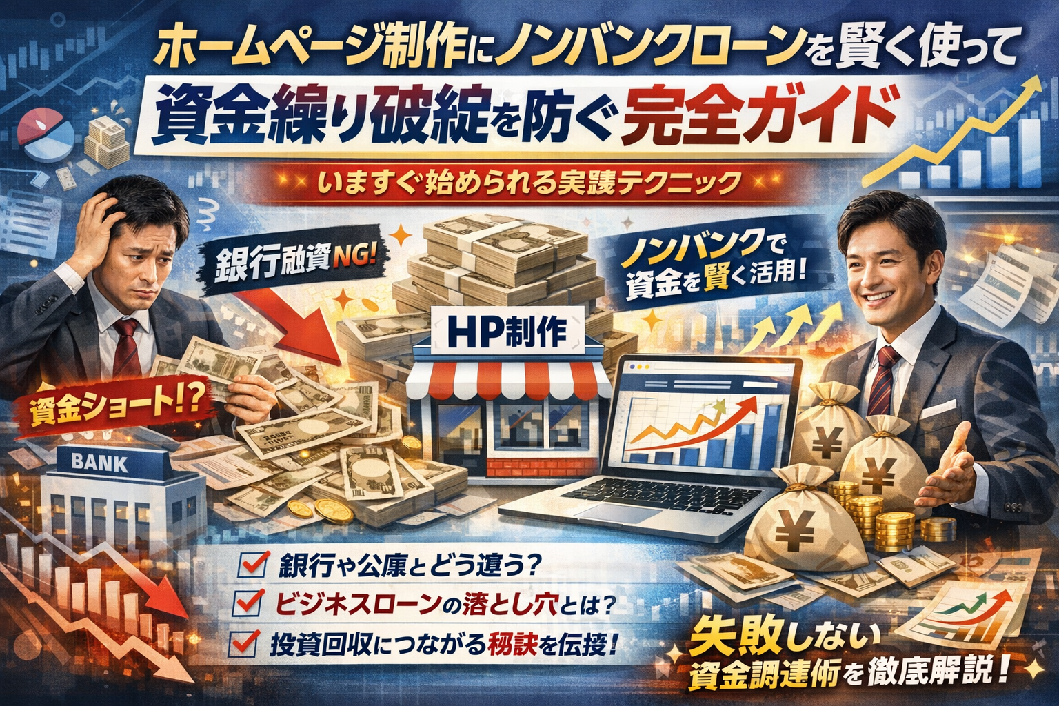 本記事では、ノンバンクとは何か、銀行融資や日本政策金融公庫との違い、法人と個人事業主で通りやすさがどう変わるかを3分で整理したうえで、ノンバンク融資のデメリットやブラックOK・事業者ローン審査激甘の裏側を現場目線で分解します。そのうえで、ホームページ制作費や広告費をノンバンクローンで賄う際に、返済開始時期と集客効果のタイムラグ、税金や社会保険、既存借入、ホームページの見せ方まで含めてどう設計すれば、資金繰り破綻ではなく投資回収につながる一手になるのかを具体的に示します。この記事を読み進めるかどうかで、これから組むローンが「つなぎ資金」になるか「最後の一手」になるかが変わります。