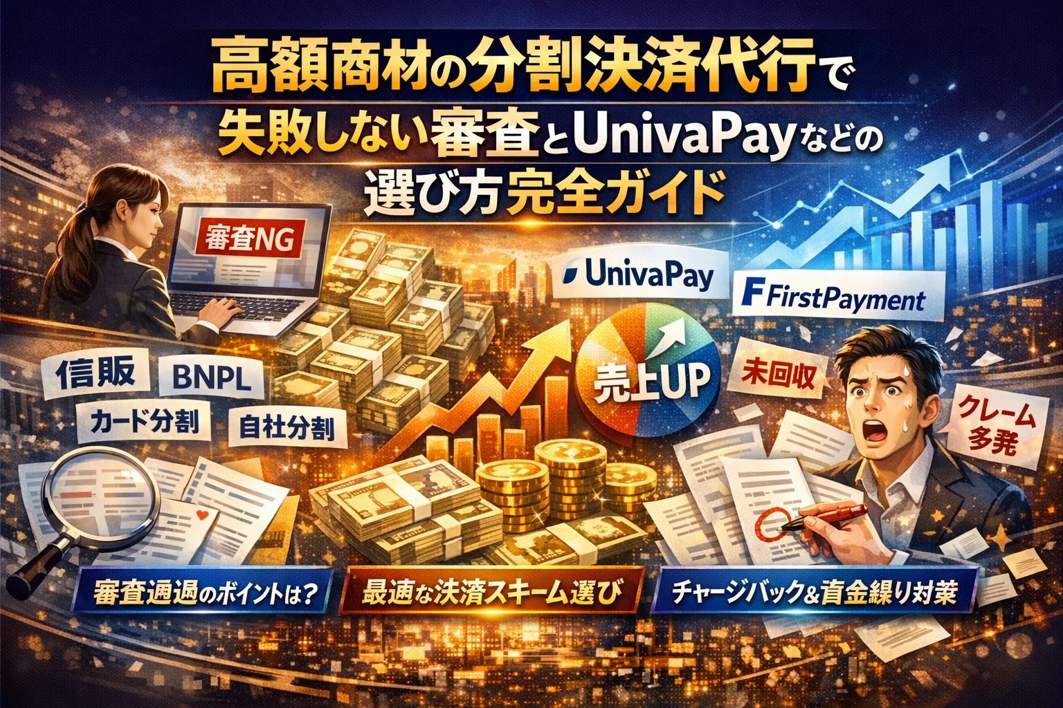 高額なスクールやホームページ制作、エステなどを扱っているのに、分割決済代行を入れても売上もキャッシュも思ったほど増えない。その原因の多くは「どの会社を選ぶか」以前に、スキーム設計と審査の目線を外していることにあります。UnivaPayやFirstPaymentをはじめとする決済代行は、分割手数料や一括入金型の分割決済の可否だけで比較しても、本当に欲しい結果にはつながりません。高額商材では、信販やBNPL、自社分割、カード分割をどう組み合わせるかで、審査通過率、入金サイクル、未回収やチャージバックのリスクがまったく変わります。この記事では、単なるサービス紹介ではなく、「高額役務・情報商材が実際に審査で止まるポイント」と「どの分割決済代行スキームをどう選ぶと手元資金と成約率が最大化するか」を実務レベルで分解します。タイトル通り、読み終える頃には自社のフェーズ別に最適な構成と、UnivaPayなど既存候補が通らない場合の打ち手まで具体的に描けるようになります。読むかどうかで、次のローンチの売上と資金繰りは確実に差が出ます。