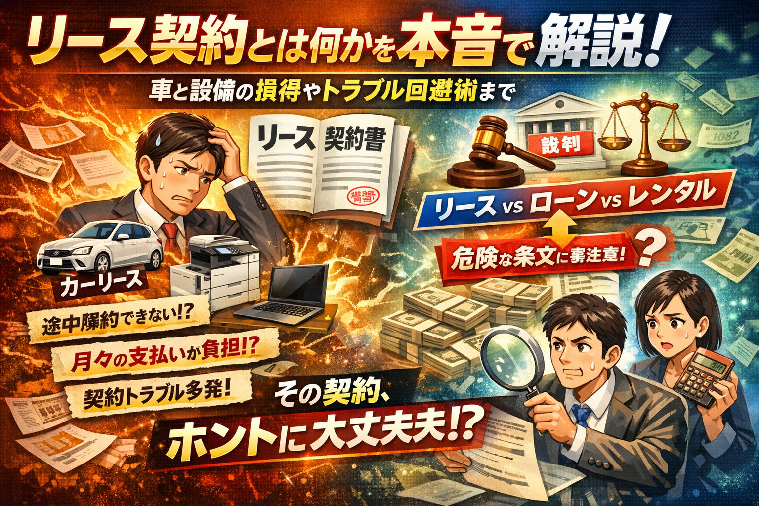 本記事は、車のリース契約からコピー機や設備、ソフトウェアまでを対象に、リース契約とは何かをわかりやすく整理しつつ、「カーリースやめとけ」「デメリットだらけ」と言われる理由、リースとローン・サブスク・不動産賃貸借契約の違い、民法や税務上の扱い、そしてトラブルや裁判に発展しやすい条文の読み方まで一気に押さえます。さらに、すでにリース契約がある方向けに、期間と残額、満了時のオプションを棚卸しし、解約できない契約を見抜く実務ステップも具体化しています。この記事を読み切れば、「リース契約とは何か」を理解するだけでなく、自分や自社が今サインしようとしている、あるいは既に結んでいる契約が得なのか損なのか、今どこで止まれば被害を抑えられるのかまで自力で判断できるようになります。