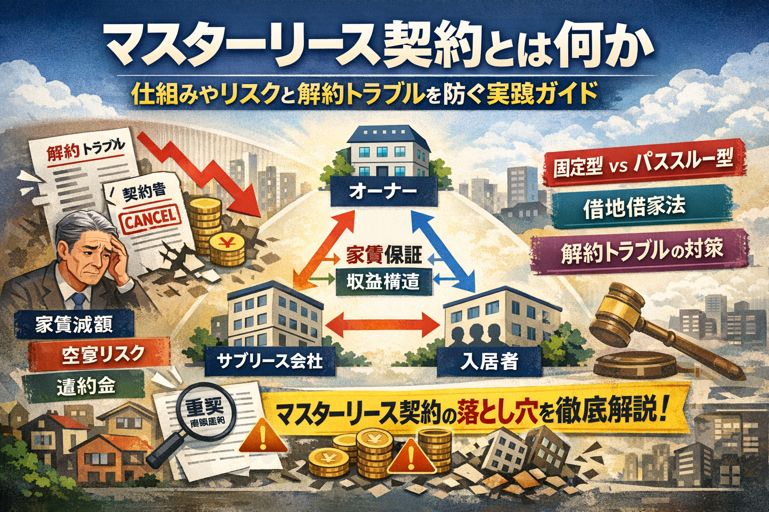 本稿では、不動産マスターリース契約を仕組み・法制度・収益構造の3レイヤーで分解し、サブリース、管理委託、プロパティマネジメント、自主管理との違いを「誰がどこまでリスクを持つか」で一気通貫で整理します。定義やメリットデメリットだけでなく、固定型とパススルー型マスターリースの違い、借地借家法と解約正当事由、特定賃貸借契約と重要事項説明、家賃見直し条項や違約金、広告費・原状回復費・修繕負担の落とし穴まで、現場で実際に揉めている論点に踏み込みます。
