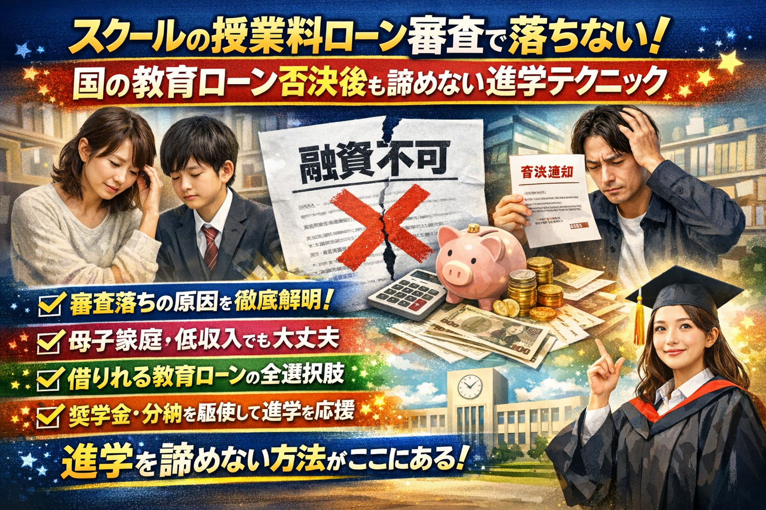 「どの教育ローンがいいか」「審査に通りやすい銀行はどこか」を検索しているあいだに、本当に守るべきは「進学の席」と「家計の安全」なのに、時間だけが失われていませんか。多くのサイトは国の教育ローンの条件や低金利ランキングを並べるだけで、母子家庭や年収が低い家庭が直面する「審査落ちの現実」や、「スクール授業料ローン審査」で何が起きているかまでは踏み込んでいません。