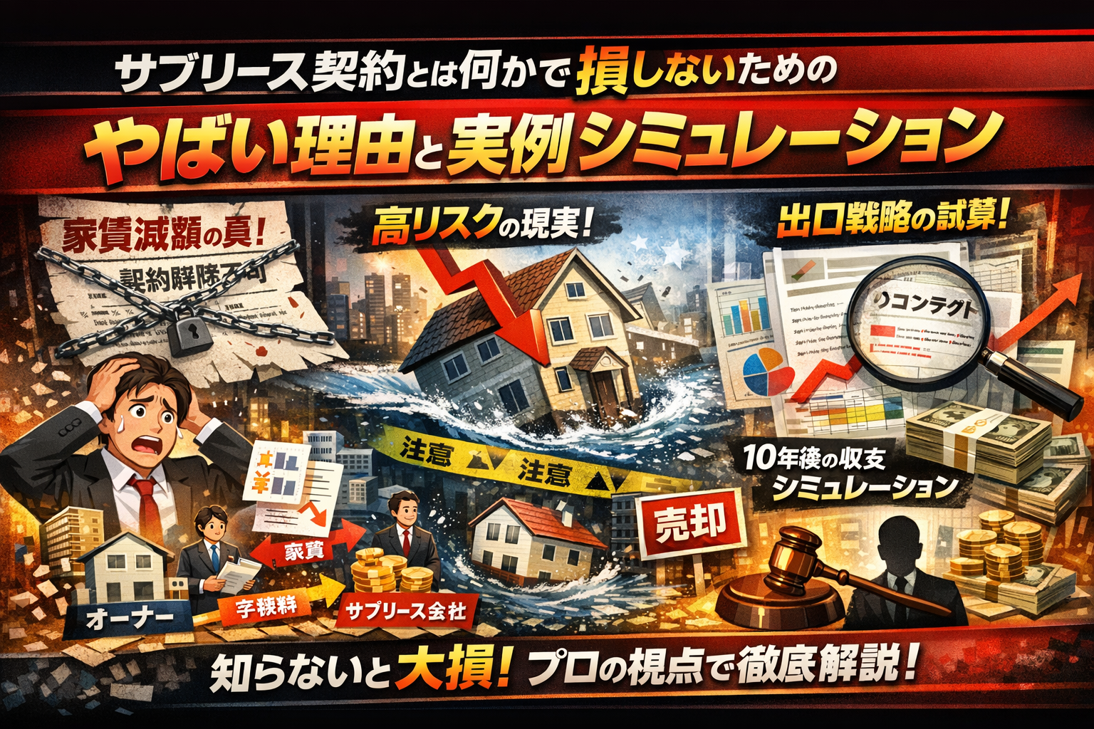 あなたの不動産が静かに目減りしている原因は、「サブリース契約とは安定収入をくれる仕組みだ」という思い込みかもしれません。公的機関の情報が示しているのは、家賃保証や一括借り上げが「空室リスクゼロの夢の制度」ではなく、賃料減額や解約制限、修繕費負担を通じてオーナーの手残りを大きく左右する高リスクな長期契約だという現実です。にもかかわらず、多くのオーナーは、不動産サブリースの構造やマスターリースとの違い、サブリース賃料の計算方法を理解しないまま判を押しています。一般的な「メリットデメリットまとめ」では、このズレは解消できません。この記事では、サブリース契約とは何かを、一括借り上げ契約と通常の管理委託と比較しながら、お金の流れと契約書条文を10年以上のキャッシュフロー設計図として読み解く視点で解説します。トラブル事例や判例、賃料減額・解約交渉の現実、サブリース物件売却の出口戦略まで、一度で俯瞰できる構成です。すでに契約中の方も、これから提案を受ける方も、「どこまでが許容できる条件か」を自分で判断できるようになります。