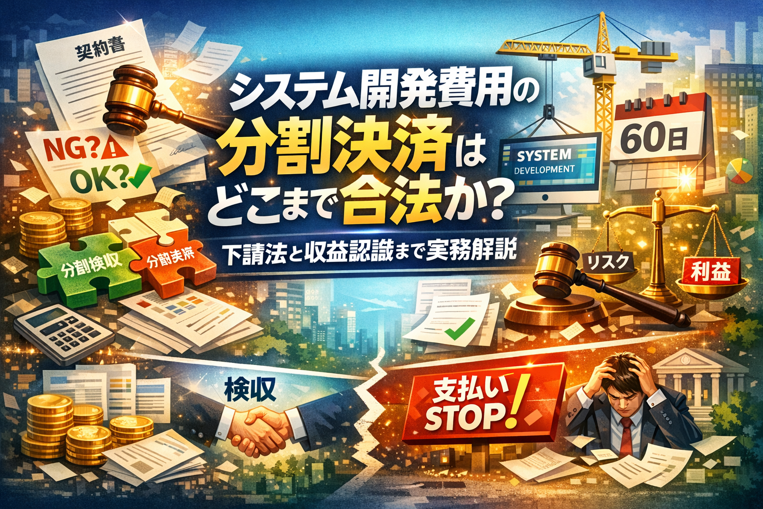 システム開発費用を分割決済にした途端、下請法違反のリスクが立ち上がり、収益認識と税務も一気に複雑になります。分割検収や分割納品、出来高売上計上、長期工事の部分完成基準は、それぞれ単独ではなく、契約書の検収条項と支払サイトの設計次第で「合法な資金繰り改善策」にも「違法な不当分割」にも変わります。みなし検収や早期検収も、条件を外すと違法と評価され、支払い停止を主張した側が逆に損害賠償リスクを負うことも珍しくありません。