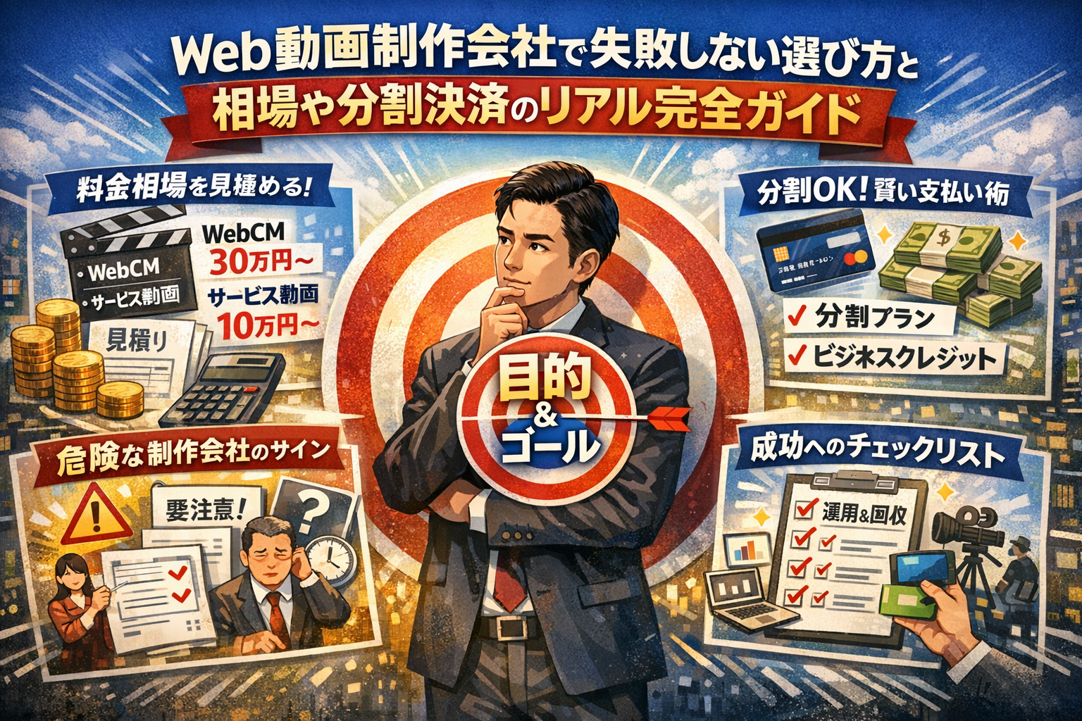 本記事では、ホームページ動画やEC動画を発注したいWeb担当者向けに、目的別の会社タイプの見極め方から、見積書の内訳の読み解き方、「映像制作会社やめとけ」と言われる発注先のサイン、Webサイト制作と動画制作をまとめて依頼する際の落とし穴まで、実務目線で整理します。さらに、ほとんどの比較サイトが触れていない分割決済やビジネスクレジット、審査と契約実務、制作会社側のキャッシュフローまで踏み込むことで、「どう選び、どう支払い、どう回収するか」まで一気通貫でイメージできるように設計しています。