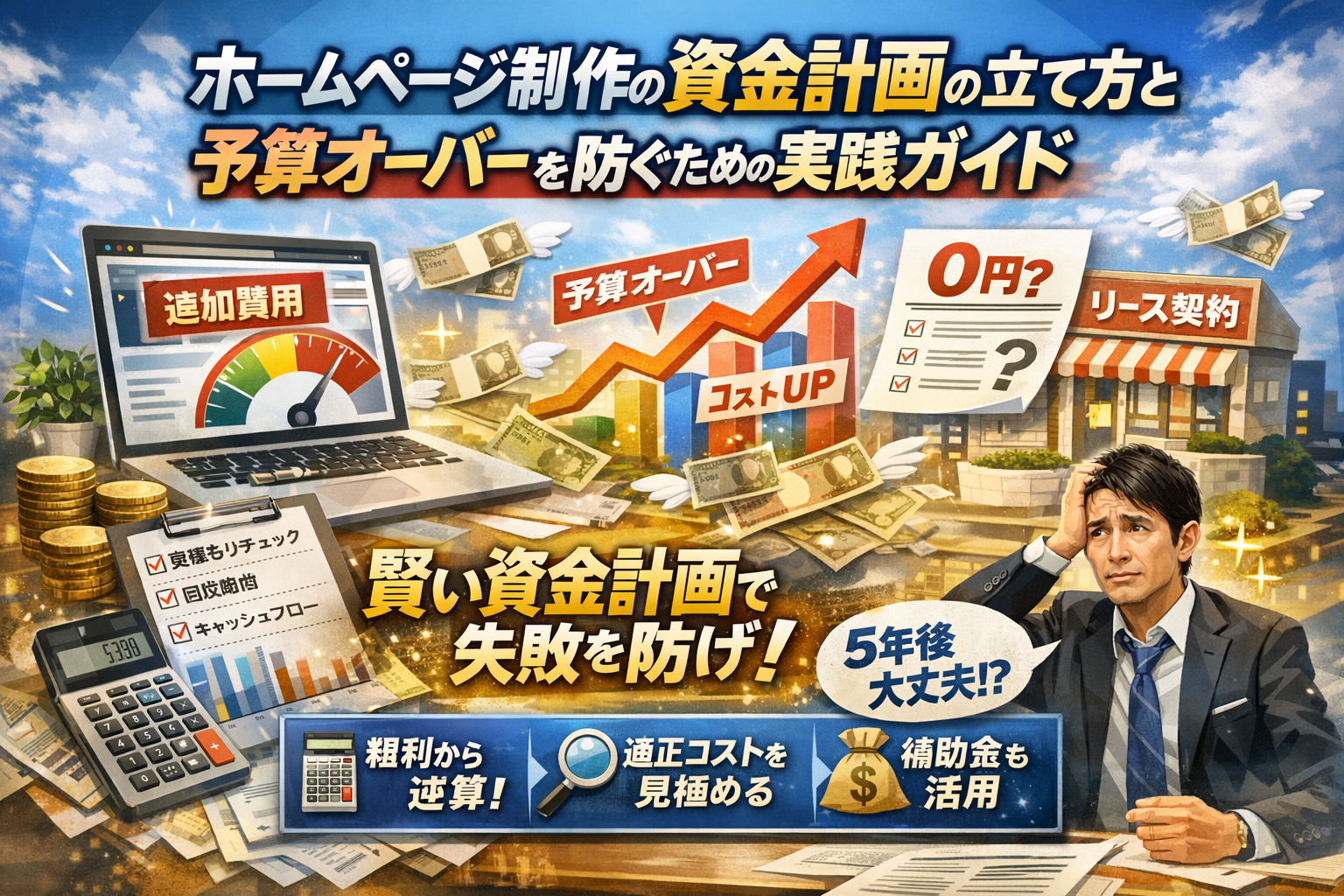 あなたのホームページ制作費は、見積書に書かれた金額よりも静かに膨らむ可能性があります。制作費だけを基準に判断すると、追加費用で2〜3割オーバーし、運用や広告に回すはずだった原資が消えていきます。さらに「制作費0円+月額課金」型やリース契約を安く見積もると、5年後の総額で一括払いより重い負担になりがちです。検索でよく出てくるWebサイト見積もり相場やホームページ制作料金表、見積もりシミュレーターの解説は、あくまで「価格の比較」までが中心です。本当に守るべきなのは、いくらまで投資してよいかを粗利から逆算し、回収期間とキャッシュフローを崩さず、補助金や資産計上・勘定科目まで含めて資金計画を組むことです。この記事では、ホームページ制作見積書やWeb制作費用内訳の読み解き方から、フリーランスと制作会社・月額サービスの費用構造の違い、支払い方法別の資金繰りへの効き方、小規模事業者持続化補助金を組み込む際の注意点まで、現場のプロが使っている実務ロジックを一つのフレームに整理します。読み終える頃には、「どの金額なら安全圏か」「この見積もりは妥当か」「5年先まで資金がもつか」を自分で判断できる状態になっているはずです。