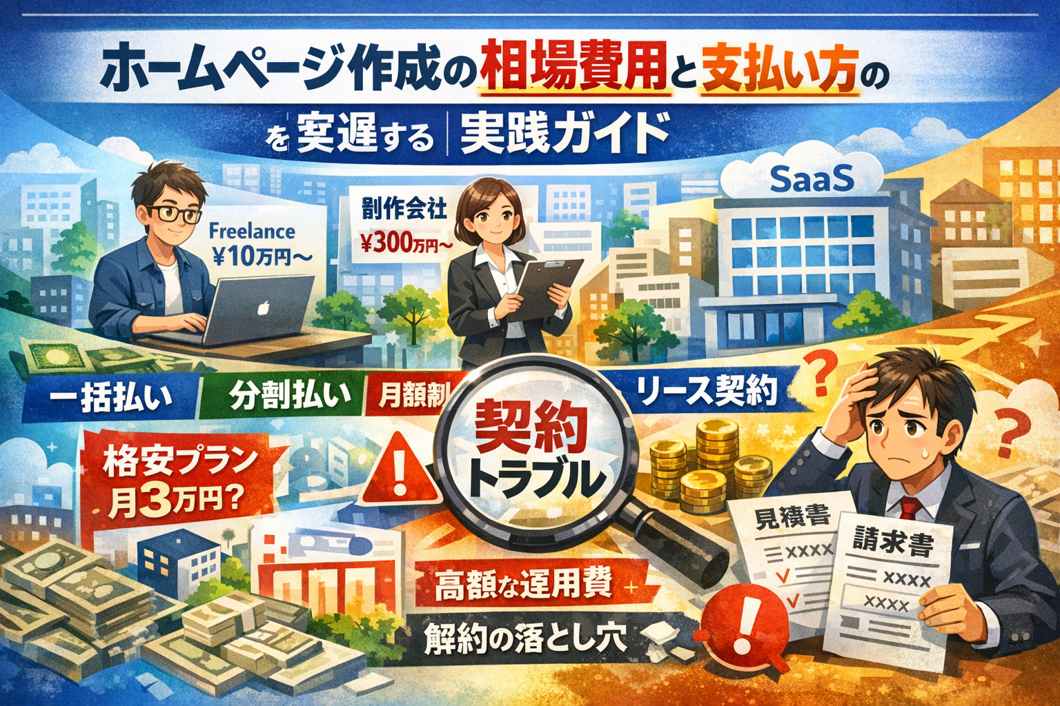 ホームページ作成の費用は10万〜300万円以上とよく言われますが、この幅の正体を曖昧なまま見積書を眺めていると、制作費よりも「支払い方」と「契約条件」で大きく損をすることになります。しかも月額3万円や格安プランなどの「一見お得な料金表示」は、総額や所有権、解約条件まで並べて比較しない限り、本当に安いのか判断できません。