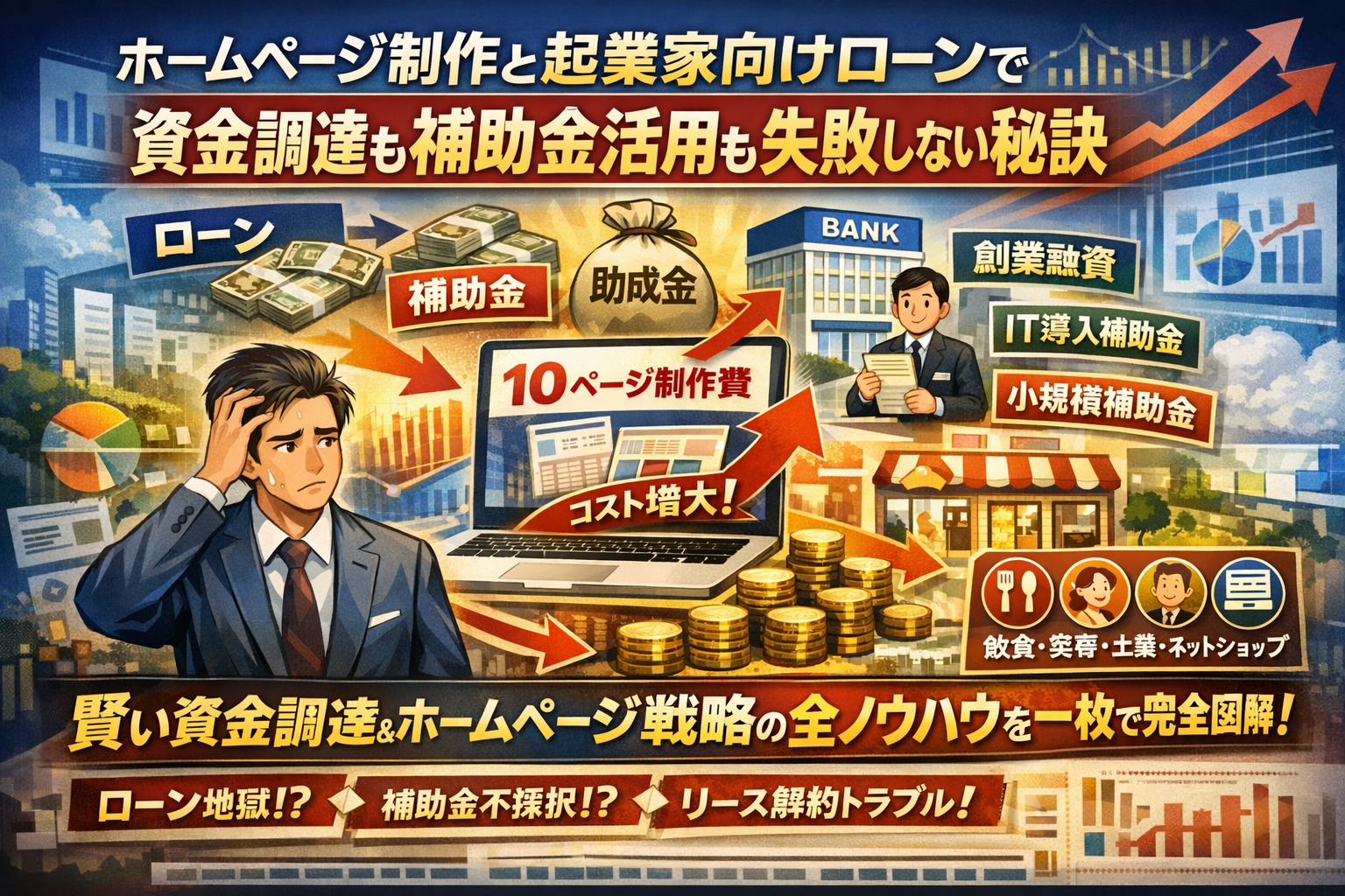 ホームページ制作費を「とりあえずローンで」「補助金が通ったら払う想定で」と決めてしまうと、手元の現金より先に毎月の固定費だけが膨らみ、気づいたときには高額リースや解約不可契約に縛られている起業家が少なくありません。しかも、ローンや創業融資、IT導入補助金、小規模事業者持続化補助金、自治体のホームページ作成補助金は、それぞれ解説されていても起業フェーズ別にどう組み合わせるべきかまではほとんど語られていません。